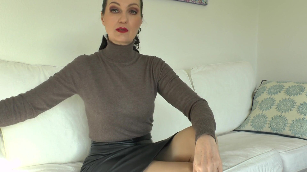 Today I'm wearing a beautiful, tight brown cashmere turtleneck sweater and a tight leather skirt. You can stare at me again. You can sniff my sleeves. I'll rub them on your face. And you can bury your face in the sweater again. Stepmother's sweaters are so cozy and soft. You can really let loose and masturbate. And finally, you cum on my sweater!