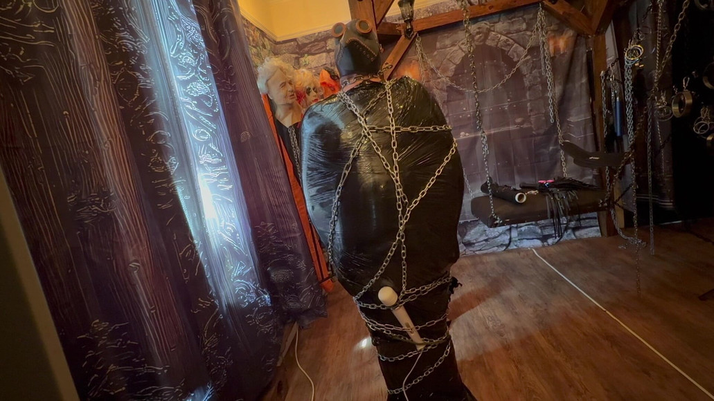 Being secured to the post with chain and pallet wrap. With a nice treat of a wand secured on his cock, for some lovely orgasms. all to keep me a mused while I edit more content!
