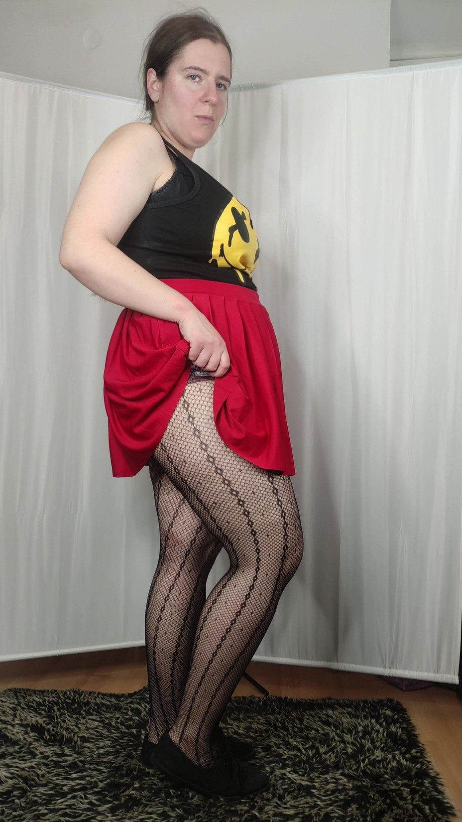 [4k] Vyzkoušejte vzorované punčocháče a červenou minisukni