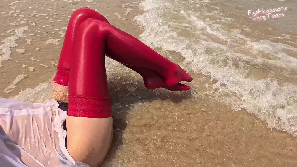 859 Shiny red spandex stockings on the beach 2
