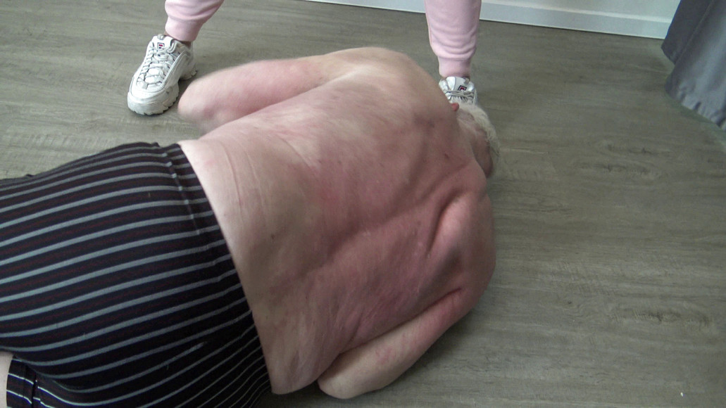 Video in German! The sadistic home help beats her poor old patient red on the floor. The devilish young nurse ruthlessly whips her frail slave's back with red welts that ooze. Then she jumps on his tormented red back and tramples on the whipped areas. She jumps on him with her sneakers. But that's not all, the cruel sadist has another perfidious idea. She now sprinkles salt in his open wounds. In fact, she gets the salt and sprinkles it on his red, spots. Then she whips him even more and jumps on the wounds with her feet. She uses her sneakers to pierce the salt into the flesh of his pathetic c rose. What a horrible sadist!