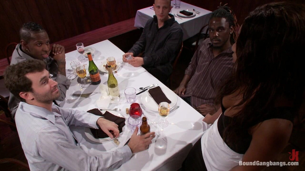 Leilani Leeanne moonlights as a waitress when she’s not shooting porn. Tonight she has to deal with a table full of rowdy gentlemen who don’t care it’s almost closing time. Leilani makes the mistake of complaining to her boss, John Strong. You see, these are John’s friends, and he insists she apologize. Apologize by sucking everyone’s cock. This only whets their appetite and they can’t wait to sink their teeth into Leilani’s juicy round ass. Our humbled hostess is dragged into the backroom for a full-course gangbang. She learns the hard way that the customer is always right.