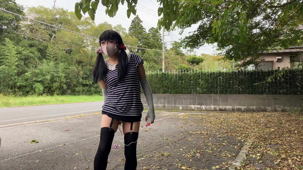 There are many anglers and people walking in the park during the day, and the risk of being exposed is high, so I get nervous. Wear pants that open your crotch and take a walk in the open. On the road with a lot of car traffic, a rotor with a bell is inserted into the tuck and anus to perform a masturbation challenge.