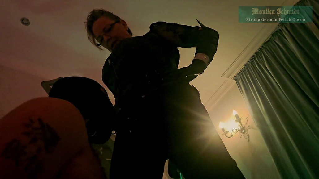 My little cuckold is getting a lesson in blowjobs today. After all, he should learn how to suck cock properly. Because when my real lover comes to visit me, he should serve us as a useful cock whore. I wear a latex strapon and my beautiful long leather gloves. His useless little penis is locked in the chastity belt. He should learn how to swallow sperm. I spit into his slave mouth and onto the floor.