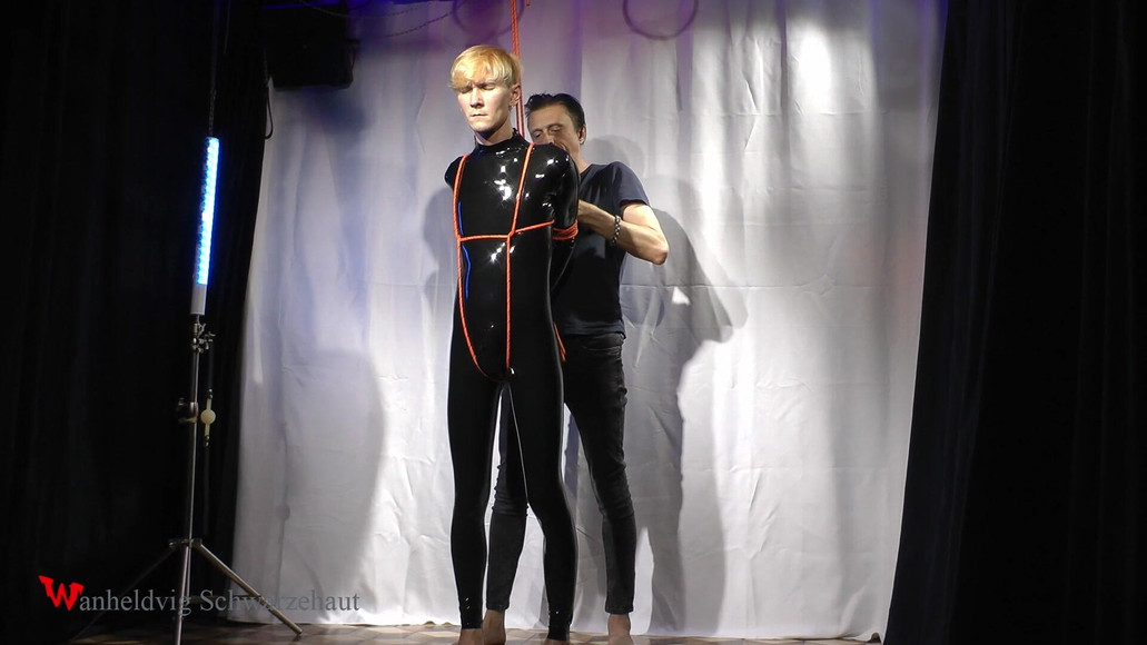 My idea today is to put the guy in strange and uncomfortable conditions. He's wearing a latex suit, I gagged him and put a red latex mask over everything. The guy is tied up with ropes and suspended in an upright position. This gives him some freedom of movement. Now I want to play with him. When he has these mixed feelings. But yet his dick is still hard. Isn't it just me who likes it all?