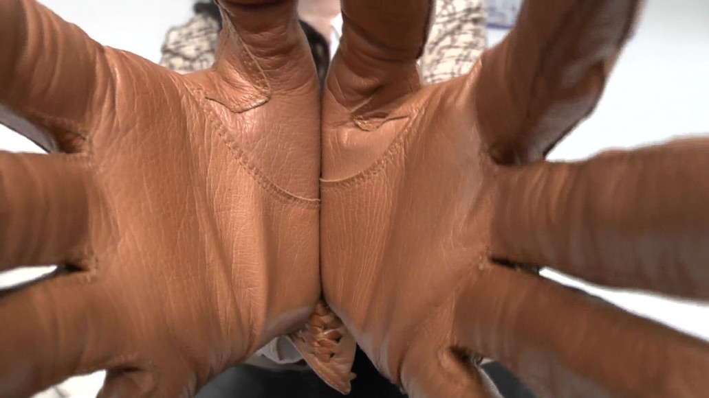 You're early, look, I haven't even put my gloves on yet! I'm putting my gloves on. Ah, is that why you're early? Because you want to watch me? Aha! Good, kneel before me, hold onto the tops of my boots. Sniff my brown leather gloves. That's a good prelude to our session today! The smell of leather always makes you so willing! Yes, and it turns you on when you're allowed near me. That's exactly how I want you, willing and horny. Then you'll be able to take more. Keep sniffing my gloves, inhale the scents. While you do, I'll tell you what I have planned for you today. I'm going to whip you, and I might use the cane again, too. Now, pamper my gloves, kiss them!