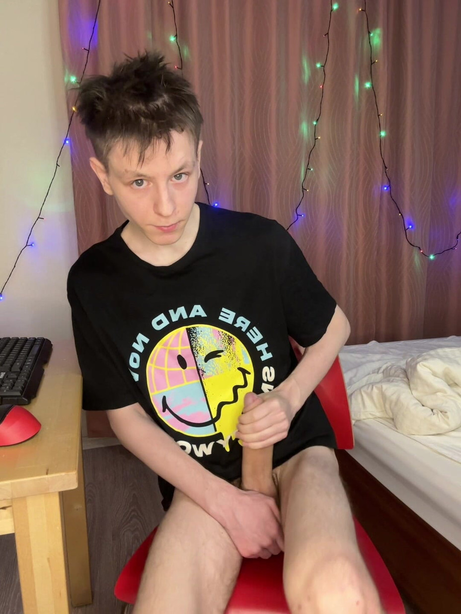 I’m an 18-year-old skinny twink with a massive young cock that barely fits in my hand. Watch this amateur twink strip totally naked. Grab that big cock and start a hot handjob. Slow strokes from the base up to the shiny head. Then faster and faster till the veins bulge and my balls slap against my thigh. My abs flex tight. My back arches. And boom-huge gay cumshot! Thick ropes of cum blast across my chest. Drip down my abs. And I milk out the last drops onto my fingers. Homemade solo from a cute gay boy who knows how to edge himself to explosion.