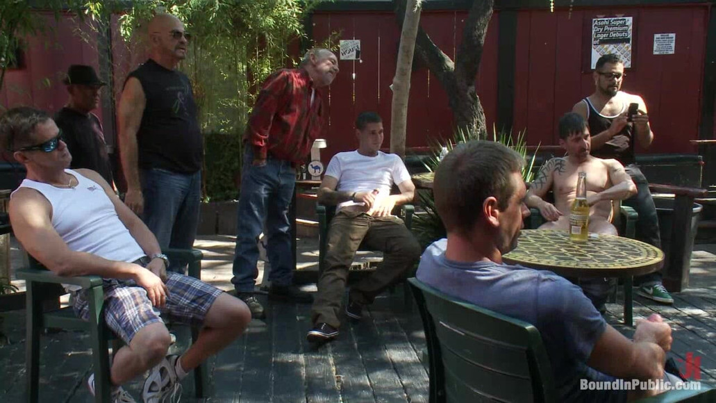 Muscle god Robert Axel takes Sebastian into the local bar. They are getting hot and heavy in public and the crowd wants to see more. Robert orders a couple of dudes to take off Sebastian’s clothes. Before you know it, everyone joins in for the feeding frenzy. Sebastian is made to suck all the cocks and one dude tries to shove a fist up the boy’s ass. Sebastian manages a bottle up his ass and the crowd goes wild. They take him out into the patio and give him a nice public flogging. Everyone takes turns fucking him. They toss him into the water fountain and piss all over the poor boy. Well, not so poor; Sebastian is in heaven.