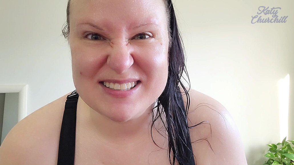 Katy Churchill just got home from the gym and she is literally dripping sweat! Sweat trickles down her face, soaking her blue T-shirt. She shows off her sweaty chest, armpits, and back while talking about how sweaty and hot she is.