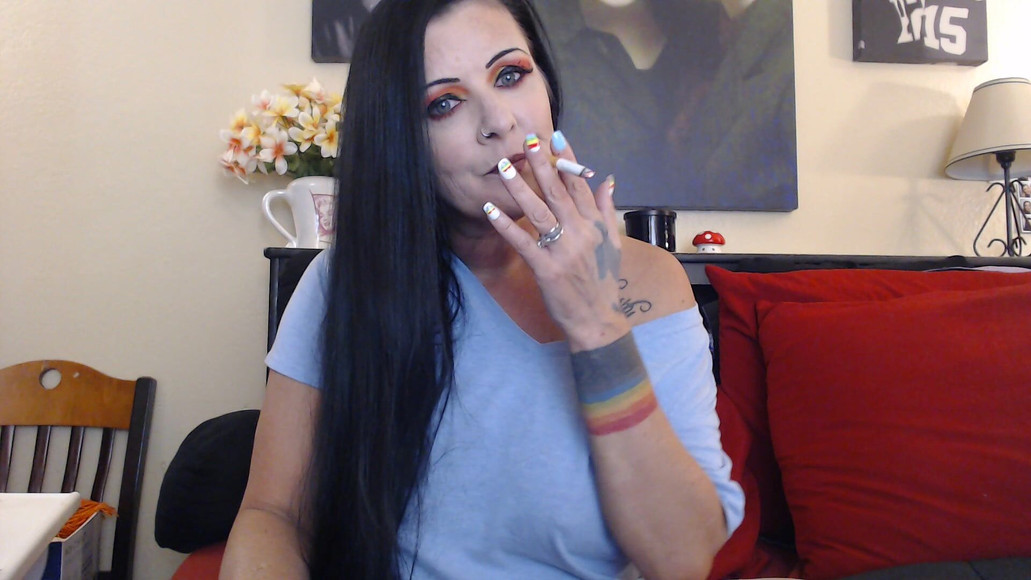 Tee shirt and panties in bed sitting up smoking nice close up.