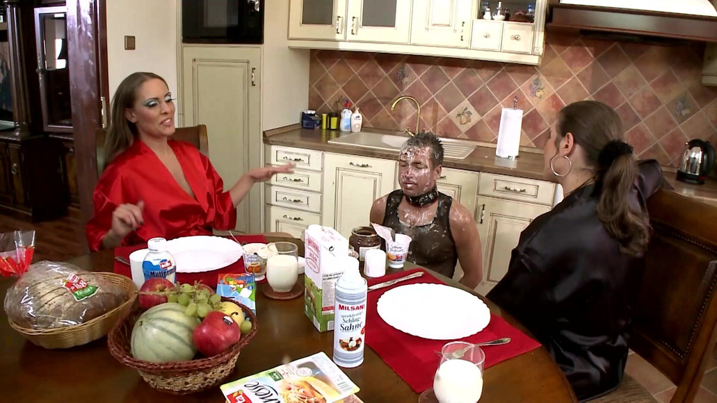 Schau zu, wie dieser devote Sklave von seiner herrin dominiert und von einer leckeren sauerei bedeckt ist. Die Küche wird zu einem Spielplatz von versauten Spaß und erotischer demütigung.