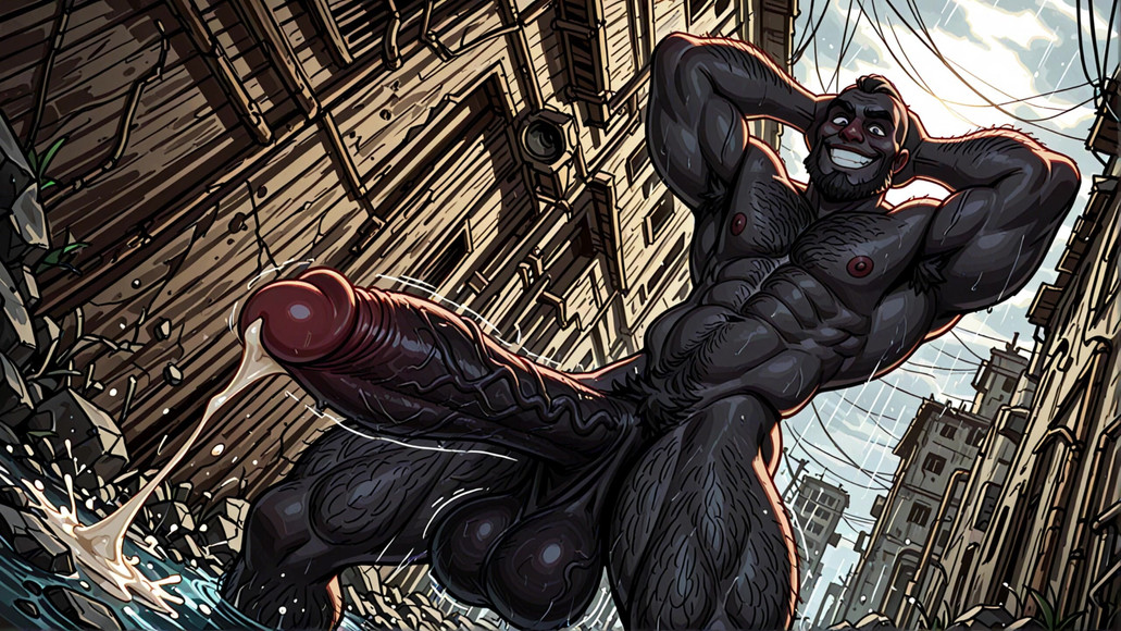 Slideshow video made with AI generated hot men. Strong and confident men who work out show off their big muscles and even bigger erect leaking cocks.