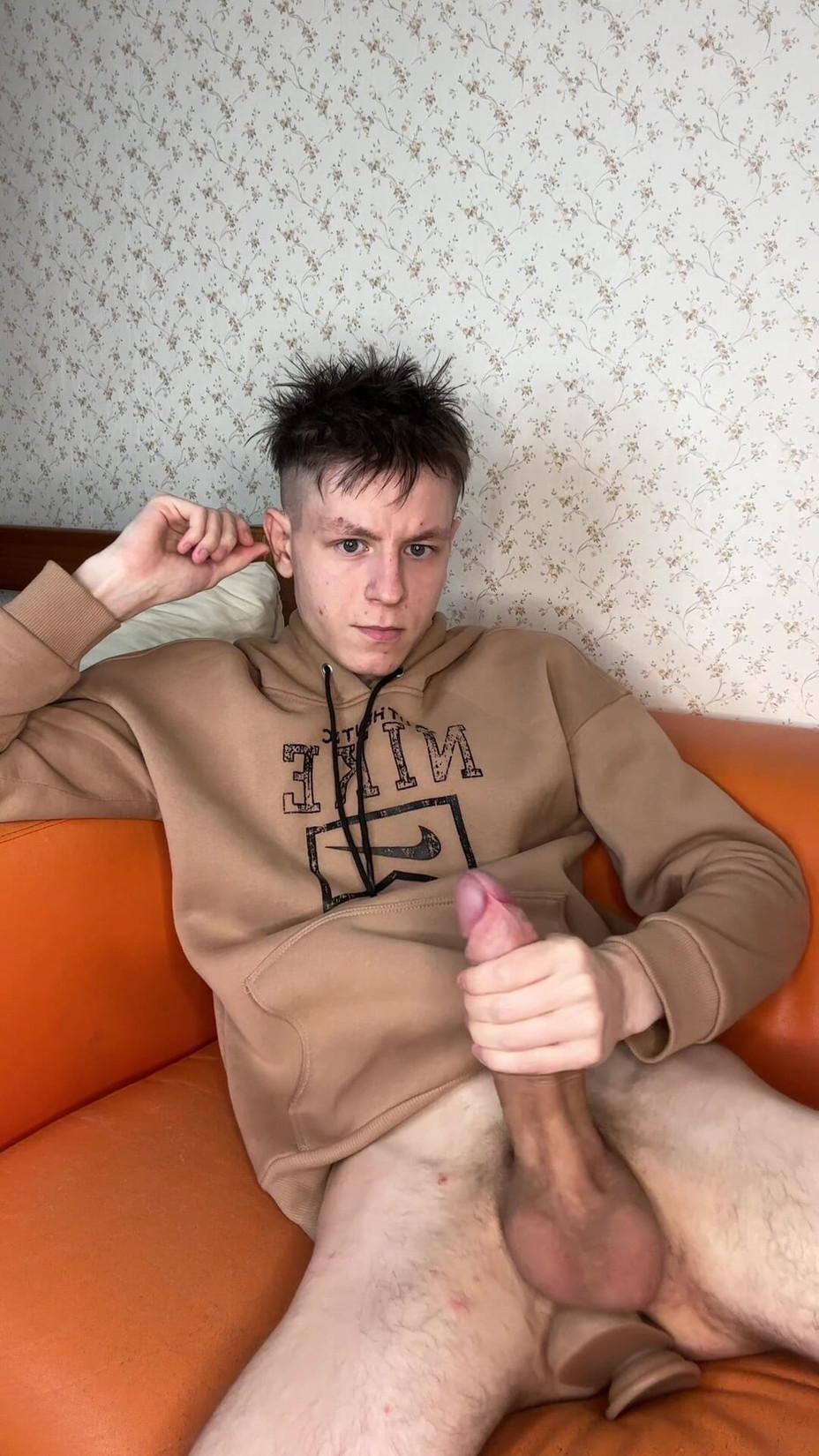 I’m an 18-year-old skinny twink with a massive young cock that barely fits in my hand. Watch this amateur twink strip totally naked. Grab that big cock and start a hot handjob. Slow strokes from the base up to the shiny head. Then faster and faster till the veins bulge and my balls slap against my thigh. My abs flex tight. My back arches. And boom—huge gay cumshot! Thick ropes of cum blast across my chest. Drip down my abs. And I milk out the last drops onto my fingers. Homemade solo from a cute gay boy who knows how to edge himself to explosion.