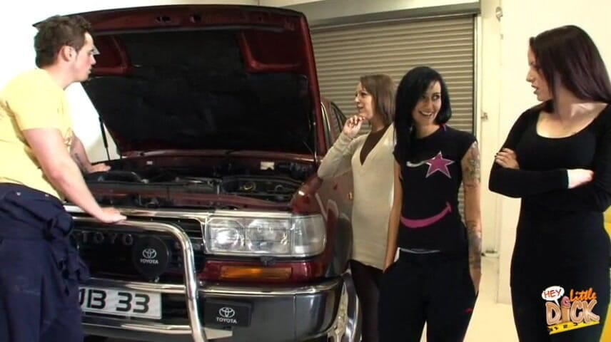 06:30Three girls go to the garage to see if their car has been fixed but all they get is a mouthy mechanic and a very expensive quote for the work. Crystal thinks he has " small cock syndrome" and is making up for his tiny willy by being an asshole. He denies it but the girls are angry with his attitude now and decide to find out. Two of them hold him while the third pulls his trousers down and they all laugh at his underwear and tiny bulge. They pulls his pants down and burst out laughing when they see his tiny cock. They take turns using two fingers to wank him while giggling and verbally mocking him. Hannah flashes her tits at him to get him harder but the girls are still unimpressed with his size. As they continue stroking his cock he starts to shoot all over the floor and the girls laugh even more at what the tiny penis has produced.