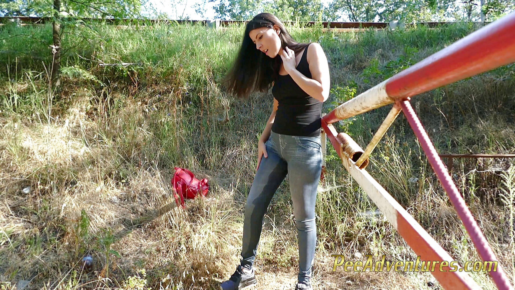 She can't hold herself and goes to the side of the road and piss herself wetting her pants. Then she lets her pants down to inspect her pussy and pulls them back and goes to meed with her boyfriend with her wet leggings on.