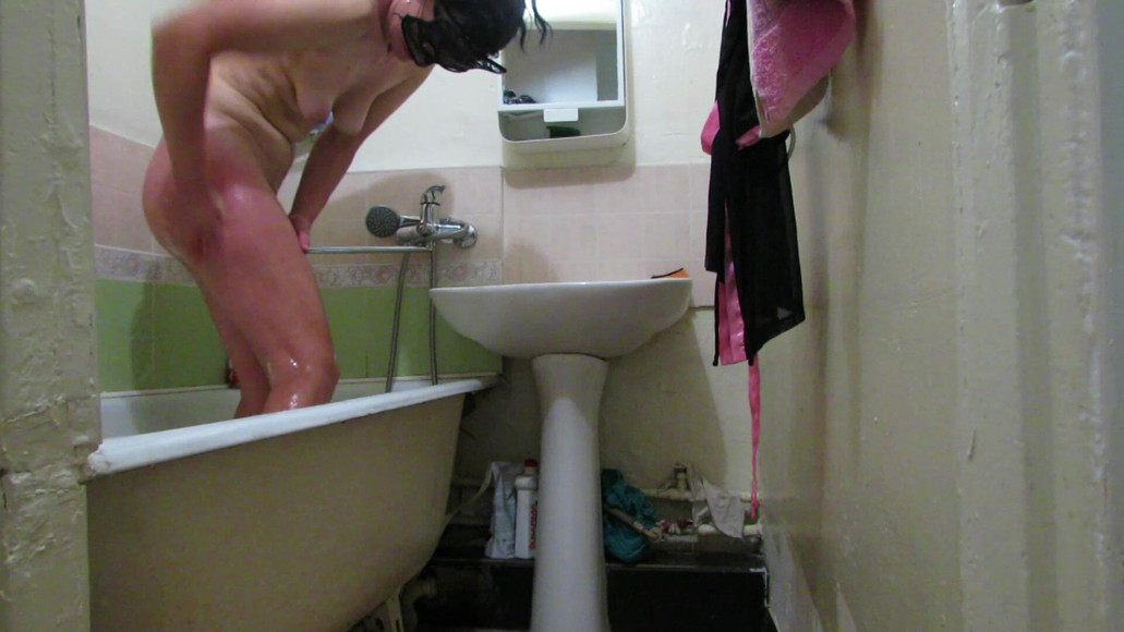 A sexy beautiful lady takes a bath, then conducts procedures to combat cellulite, rubs her ass and legs with a washcloth until red, lubricates with oil
