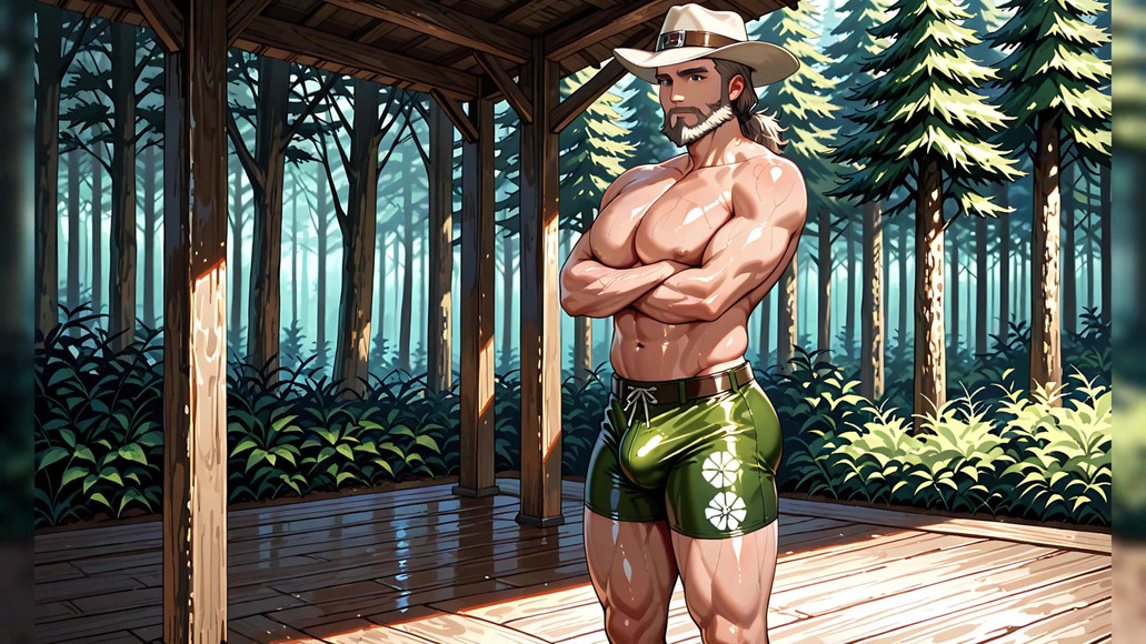 Manly muscular original characters made with AI to tease you and get your hormones going. Shirtless, hairless, and with big cock bulges hiding in their shorts.