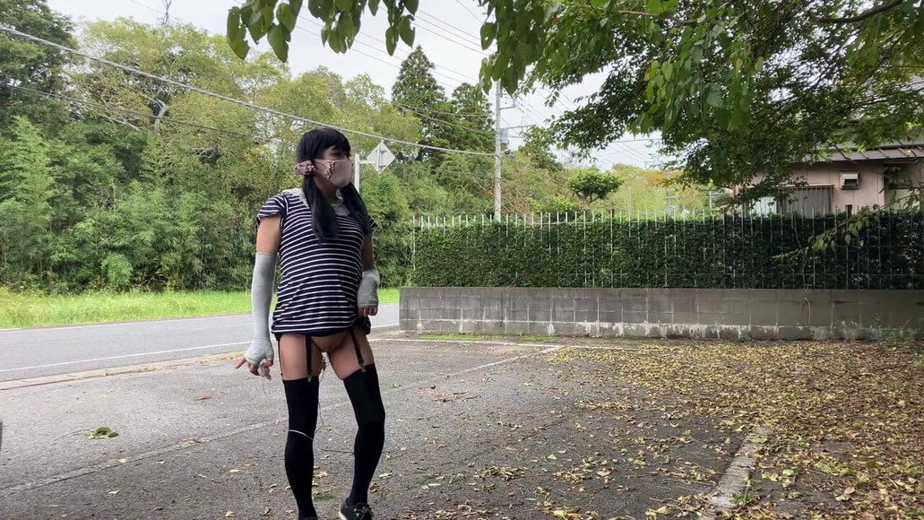 There are many anglers and people walking in the park during the day, and the risk of being exposed is high, so I get nervous. Wear pants that open your crotch and take a walk in the open. On the road with a lot of car traffic, a rotor with a bell is inserted into the tuck and anus to perform a masturbation challenge.