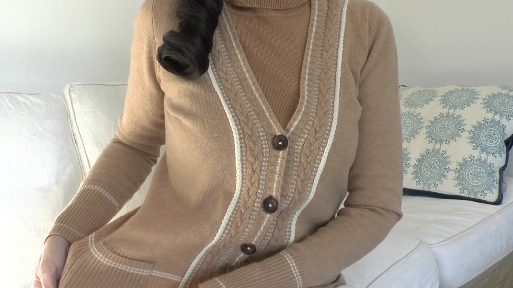 Well, you've got some nerve! You show up at my place four hours before your wedding! I was just about to change. My step-father Richard will be picking me up soon. He'll probably be here earlier than we agreed! Today I'm wearing a three-piece knit outfit. A beautiful cashmere cardigan with a turtleneck sweater underneath and knit pants. All color-coordinated. Well, you've got a big bulge in your pants again! Fine, then stare at me. Start masturbating, you don't have much time. Your step-father could be here any minute. I'll rub my soft sleeves against your face. You can sniff the cashmere and rub your face against my sweater. You can cum on my sweater! This will be our secret! Don't tell anyone! That would be quite a scandal!