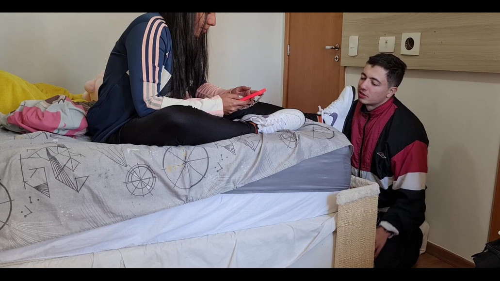 Goddess Kiffa and Mr Pine - Kiffa makes her cuck clean the same dirty sneakers used on her date. Goddess Kiffa is relaxing in bed. She is using the same sneakers that she used on her date with her alpha lover. She decides to make her cuck lick it clean! After all, a good cuck has to clean the dirty sneakers used on her date! He for her date and stayed on his knees on the stairways outside the bedroom listening to her getting fucked by her lover! She tells her friends how pathetic her cuck is. And her friends send her messages! She shows the cuck the messages! She says that she will tell even more of her friends! The cuck got worried! She orders the cuck to lick the sneakers that she uses with her alpha lover clean! She foot slaps his face while he worships her sneakers! Just for her joy! He humiliates the cuck saying how the cuck just listened to her fucking! Goddess Kiffa says how much better her alpha lover is, and that the cuck doesn't deserve to cum at all!