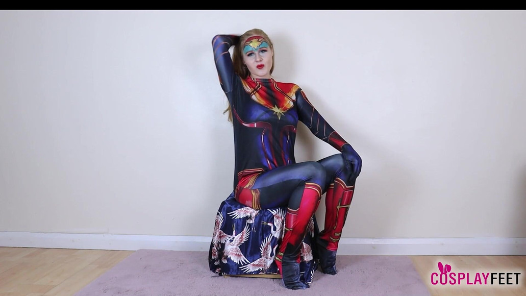 Stunningly beautiful Aurora Phoenix exudes sexiness and seductive vibes in a superhero costume. The smoking-hot babe looks sexier than ever as she flaunts her gorgeous body in a full Captain Marvel costume that complements her beautiful ginger locks and emphasizes her sensational curves. The stunning hottie seductively runs her hands on her long, shapely legs, puts her feet on a footstool, takes off her costume and lures you with her sexy feet. She then shows off her perfect butt in a tiny thong and takes off her bra.