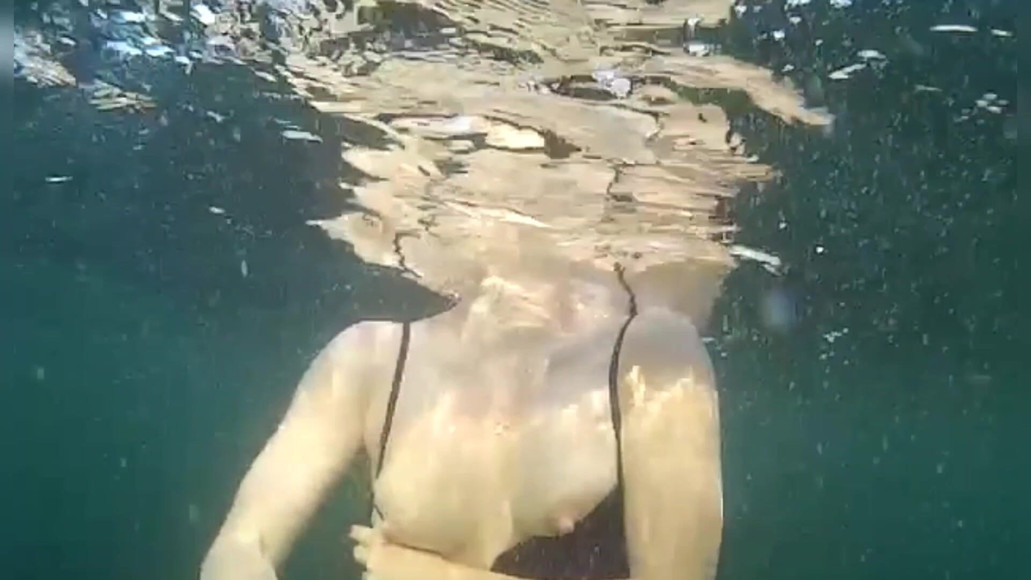 Diver took me on the cam while I was swimming in the sea and asked me to show my tits, my hard nipples and hairy pussy