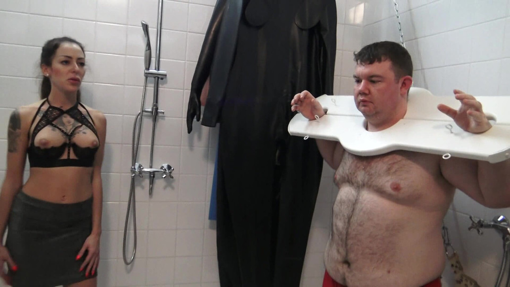 In the next round, Mistress Amrita and Aliya tie the two slaves, Olli and Pitty, back to back so they can gleefully kick them in the balls. Since they hold and pull on each other, neither falls over, and both must endure the hard kicks. From both sides, the two sadistic ladies slam their high heels and knees into the slaves' poor balls, trying to make them burst. In between, Olli receives slaps in the pillory and is completely spat on in the face and mouth. Finally, they douse the other two slaves with a waterfall of ice-cold water.