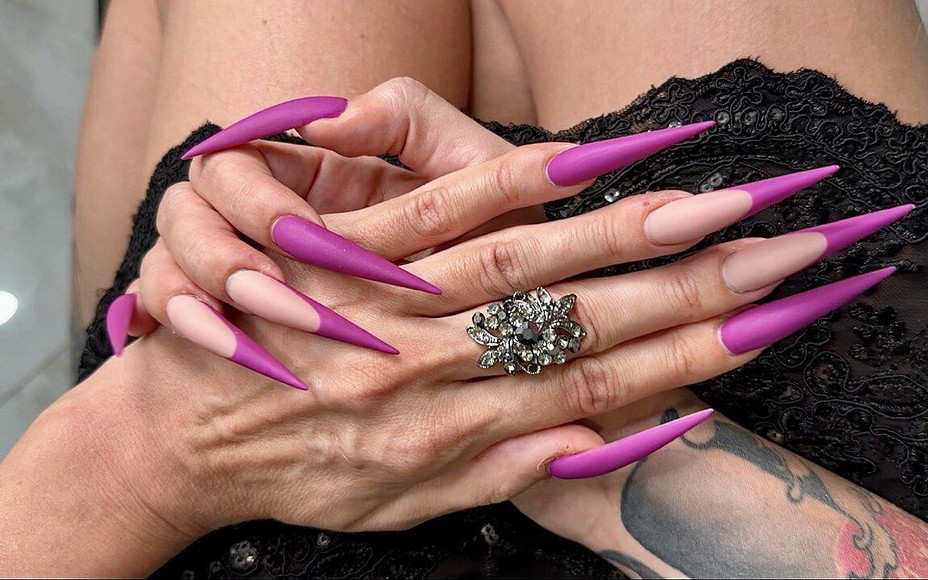 New purple color Long nails, sharp stilettos. Leg Skin scratching. Jewelry Fetish. Im tattooed skinny milf with glasses on. Brunette long hair. I'm weating tight black dress and purple high heels. Big boobs bra playing. Palms spreading very wide. Claws. Showing my long nails, playing with hair and more. Glamour and arrogant women. Worship my long nails and cum all over long fingers.