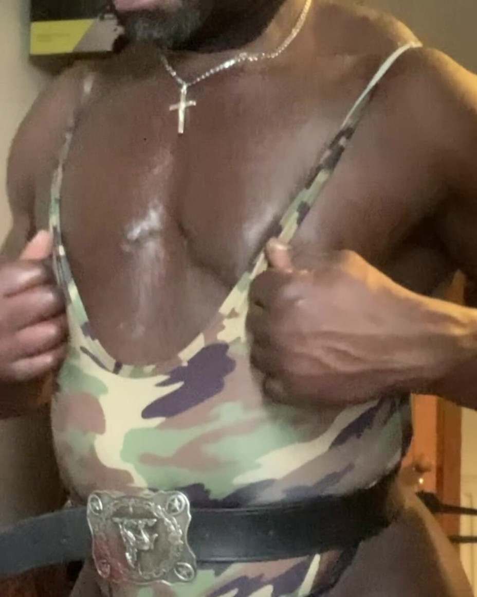 Il travestito nero muscoloso rimbalza sul giocattolo del massaggiatore della prostata indossando un sexy camouflage singlet e stivali alla coscia. Infine all'interno della scena finale una inevitabile scena di crema prostatico può essere consegnata