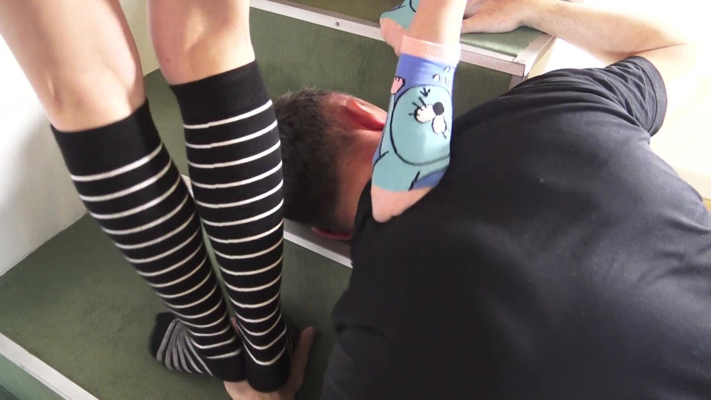 Slave Smirni has to lie with his head as a carpet on the step of the stairs and serve for the sadistic fun of the two dominating young foot girls. Princess Kirstin and Missy, now in their socks, jump on their target's head and face. They dance on his hands and head. They jump on his hands with their full weight, wanting to break them. They use his head as a trampoline. This is what these two pretty and merciless natural sadists really enjoy.