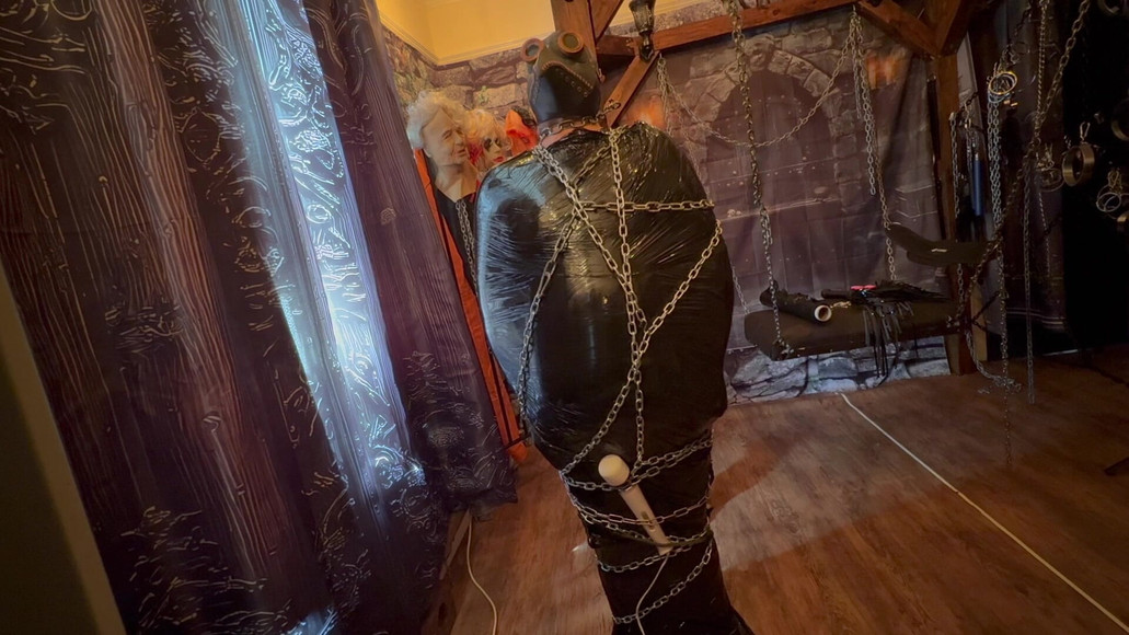 Being secured to the post with chain and pallet wrap. With a nice treat of a wand secured on his cock, for some lovely orgasms. all to keep me a mused while I edit more content!
