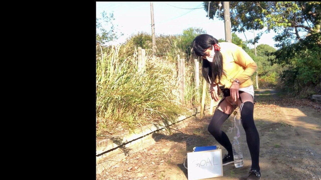 私は調教師様からのご命令の電話ボックスで露出で、再び失敗してしまいました。 やはり、周辺の電話ボックスは人通りも多く、慣れない場所での露出で緊張してしまい、電話ボックス内で3分タックおまんこさらしをするこが出来なかったのです。 私は、この失敗を調教師様へ報告をしました。 調教師様はたいへん失望されておりました。 そして、調教師様は私に罰を与えられたのです。 調教師様からの命令 電話ボックスは活動場所の付近にあるかな? 定番だが、電話ボックスで露出調教を行う。 まずは、油性マジックでタックおまんこの恥丘に shit on me を書いておくこと。 調教課題 1.鈴付きのローターをタックおまんことアナルに挿入すること。 2.パンツは履かないこと 3.スカートはクリップで常にめくれた状態にしてタックおまんこが常に見えるようにしておくこと。 公衆電話で時報を3分聞くこと 4.電話ボックス内で時報を聞いている間ははガニ股でタックおまんこさらしを続けること。 5.電話ボックス内でロータスイッチを入れておくこと、時報を聞き終わるまでスイッチを切らないこと。 6.勝手にイクことは禁止 7.全て行動を撮影すること。 調教師様からのお返事 2度目も失敗とは、本当に残念だよ。 君の失敗の原因は、私への忠誠心が足りていないからだということがわかっているのかな? 言い訳は聞かない。 タッククリトリスに500mlの水が入ったペットボトルをくくりつける。 その状態で10m以上歩くこと。 首輪に手錠をつけて手を使わないようにしなさい。 ローターをタックおまんことアナルに挿入した状態でも実行すること。