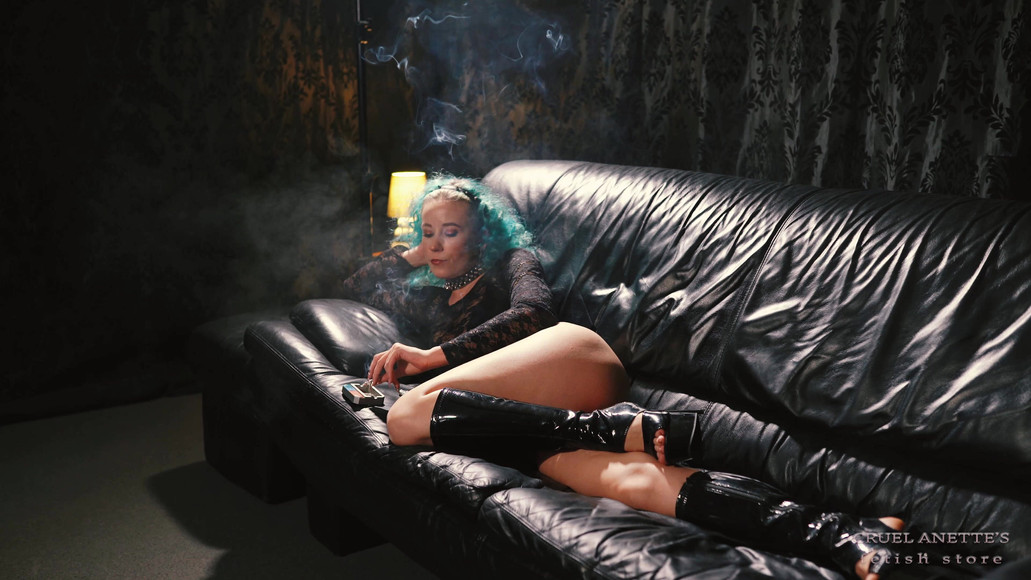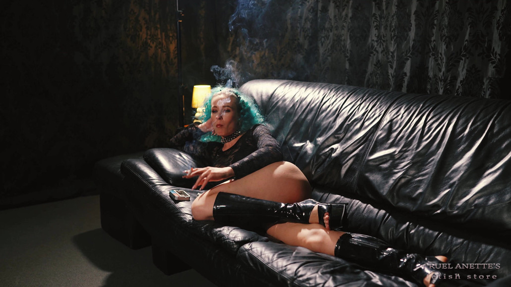 Black lace body with high heel boots, blue hair curled, Mistress Anette is laying on her side on the couch, smoking. After all those hard punishments, she deserves a few lazy minutes.