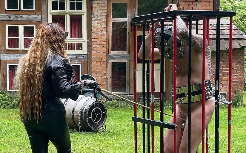 A raw, uncut FemDom session shot from five angles so you see every intense moment in full detail. The Dominatrix takes her slave to the yard and locks him in a standing metal cage — chained, arms fixed above his head, exposed and completely at her mercy. She starts testing his limits, adding weight after weight to his balls, watching his body strain as the pressure grows. Small bell clamps bite his nipples, each movement making them jingle with vulnerable sound. This is about precision and control — not chaos. Mistress builds the tension slowly, pushing him deeper into submission with every added ounce. Every sound, every tremor, every shiver is captured in close-up cinematic detail. Five cameras. Sixty minutes. One slave tested by metal, weight, and willpower — no edits, no mercy, just pure power exchange.