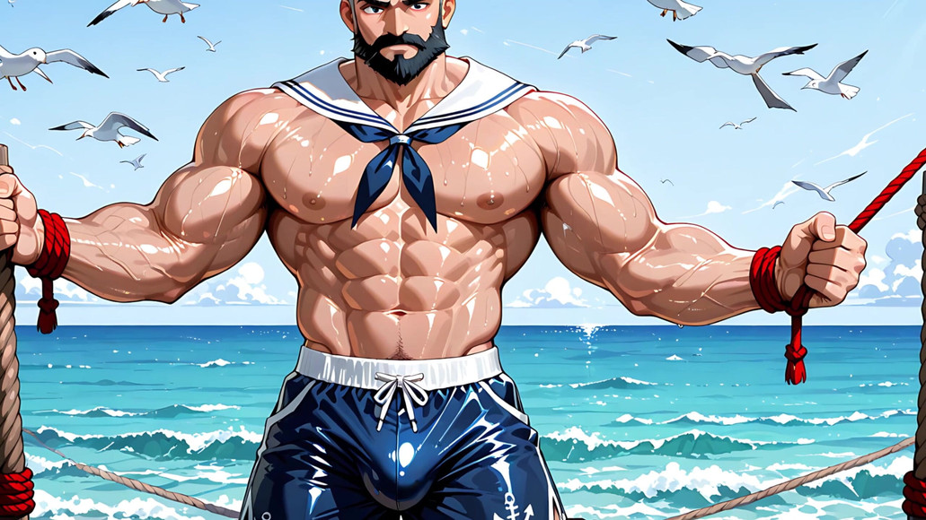 Slideshow style video. Featuring AI generated characters. Handsome guys with nice muscles. Teasing in their shorts refusing to show their full nude bodies.