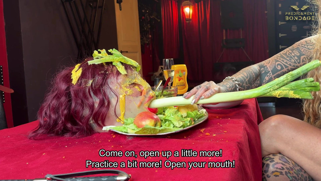 Step into a world of total domination and creative humiliation. The merciless Dominatrix sits at a dining table, her slave’s head locked in the center—exposed, powerless, and humiliated. With razor-sharp words and playful cruelty, she strips away his dignity, reducing him to nothing but an object for her twisted amusement. Her control is absolute. She taunts him, splashes vinegar on his face, smears him with dressing, and decorates him like a grotesque “head on a platter.” Peanuts, vegetables, and her mocking laughter turn the scene into a cruel work of art.