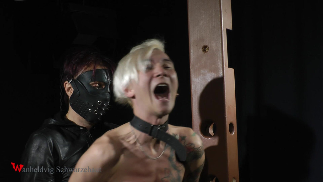 I made a new body restraint device. Hands behind and cannot be released. The leather blocking fits very tightly and Nicky could not get out. It's funny to watch his attempts