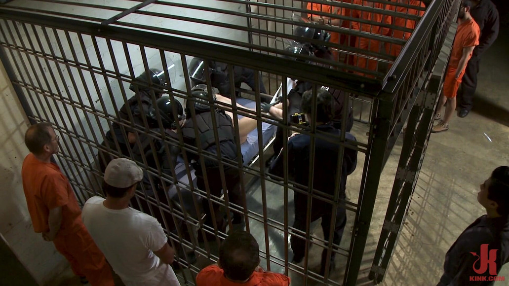 In this epic KinkMen Shoot: The cells are full of loud, horny prisoners and every correction officer is keeping a close watch. A new troublesome inmate, Jeremy Stevens, is brought in. Jeremy is told to remove his clothes and spread his legs for the strip search. The officers check his hairy tight pink hole for any contraband or weapons. Once he is in the clear, the warden informs the officers that Jeremy is offender, and should be held in solitary confinement. Jeremy becomes enraged, stripping down to his underwear, tearing apart his cell… Immediately the officers put on their riot gear and prepare for cell extraction. Jeremy is wrestled down and made to suck cock, gasping for air from one cock to the next. Jeremy is fucked by one of his fellow inmates while the officers pin him down. Cocks are lined up the stairway as the guards each fuck the prisoners mouth all the way down his throat. The guards then take turns fucking his tight hole one more time before blowing