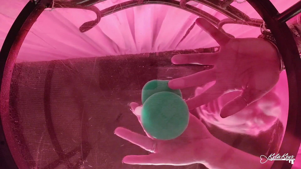 One big green suction dildo plus one clear bottom chair equals plenty of orgasms.