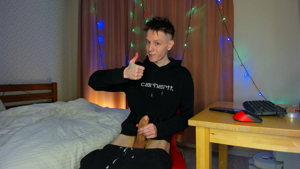 I’m an 18-year-old skinny twink with a massive young cock that barely fits in my hand. Watch this amateur twink strip totally naked. Grab that big cock and start a hot handjob. Slow strokes from the base up to the shiny head. Then faster and faster till the veins bulge and my balls slap against my thigh. My abs flex tight. My back arches. And boom-huge gay cumshot! Thick ropes of cum blast across my chest. Drip down my abs. And I milk out the last drops onto my fingers. Homemade solo from a cute gay boy who knows how to edge himself to explosion.