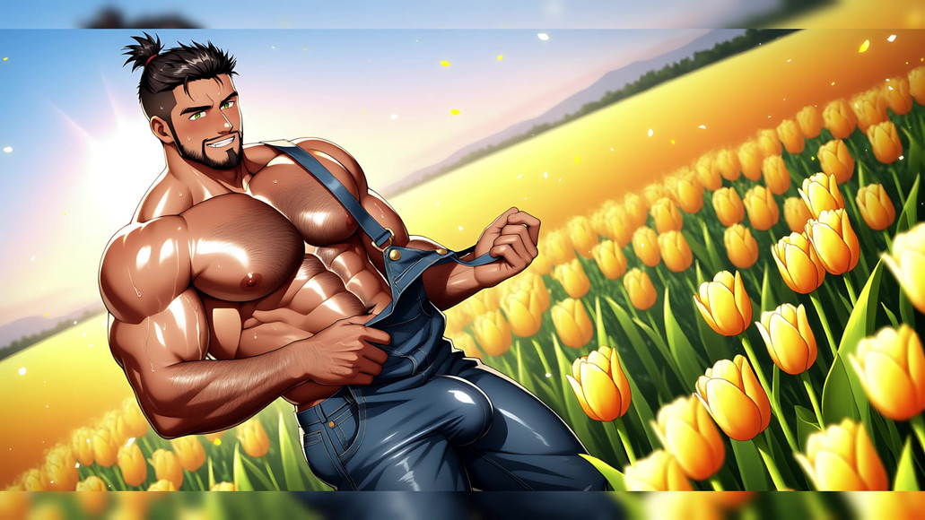 Gorgeous men with huge muscles. Made with AI! It's a mix between cartoon and anime styling. They show off their upper bodies and tease with their big bulges.