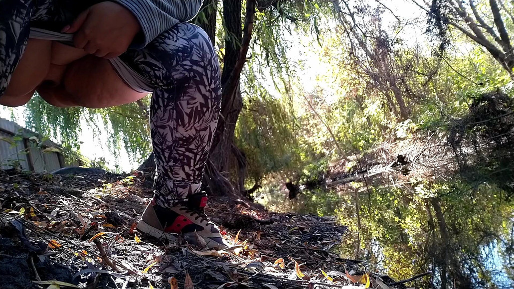 BBW in leggings pissing by the lake in a park