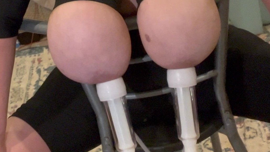 Watch stepmom milk her tits on the goat milker then she is made to bounce her udders and pull her nipples