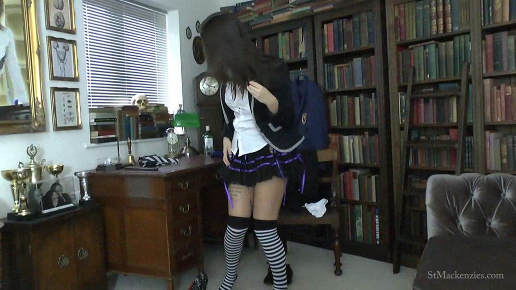 I need Lauren to sneak into the all boys college St Hugh’s to see if there is anything worth stealing. So I have left a uniform in my office for her to change into. She is not thrilled at the idea of having to dress at a boy, but she slowly starts to slip off her cheeky emo outfit and pretty lingerie. When she is completely naked she checks out the uniform one more time, but she cannot put it off any longer. So she slips on the boy’s pants and socks, the shirt without a bra, trousers, lace up shoes, blazer & tie. Finally she puts on the boys cap, and then dressed as a St Hugh’s college boy she composes herself before heading off ready to sneak her way in.