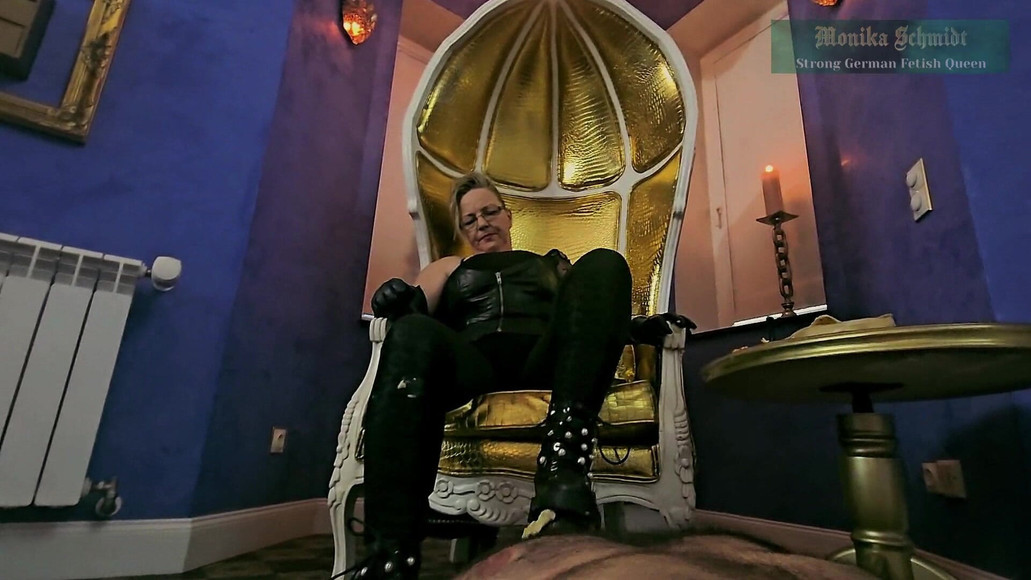 Mistress Monika Schmidt has an appetite for some fruit. My slave has the order to serve me fresh fruit. My patience with this good-for-nothing has already been put to the test several times today. He actually has the audacity to foist old fruits on his lady. But I won't let that go unpunished. I crush the rotten fruit with my boots and let it eat it off the ground. I spit the chewed remains into his slave's mouth and he has to swallow them gratefully. He has to clean the soles of my dirty boots with his tongue. I also make fun of his little dick. Have fun