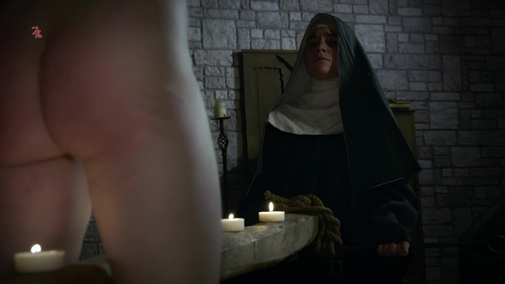 The witches' course continues and this time Judith is put in stocks. She gets ropes around her breasts and has to spread her legs. By pulling her tits she is driven to walk over a beam with candles. The interrogators also spank her ass. The whore starts to sweat as she walks... (Scene #3 from movie Tormented Whore / German with English subtitles)