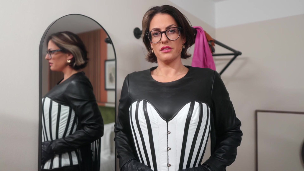 You are completely obsessed with leather and you can't take your eyes off my leather outing. Tight striped leather corset, tassled black leather dress, and a selection of soft leather gloves. Will you go for short tan gloves, long pink gloves, or the blue-black classics? No matter the colour, you love the feel, smell and look of leather and it never looks better than when on the body of a beautiful, powerful woman.