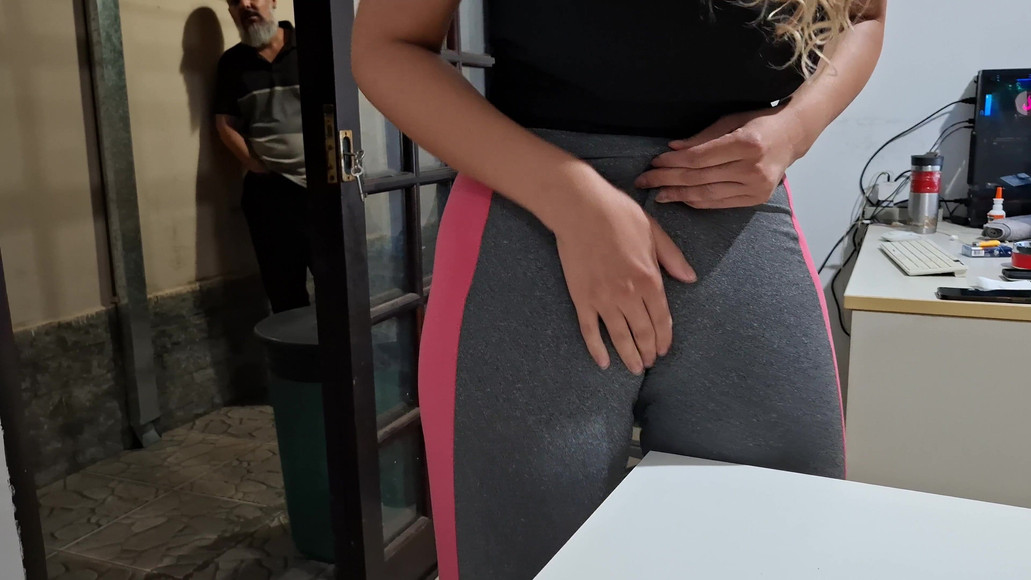 Horny girl rubs and masturbates her camel toe on the table when her neighbor arrives and helps her orgasm by masturbating her outside and inside her leggings and grabbing her nice breasts.