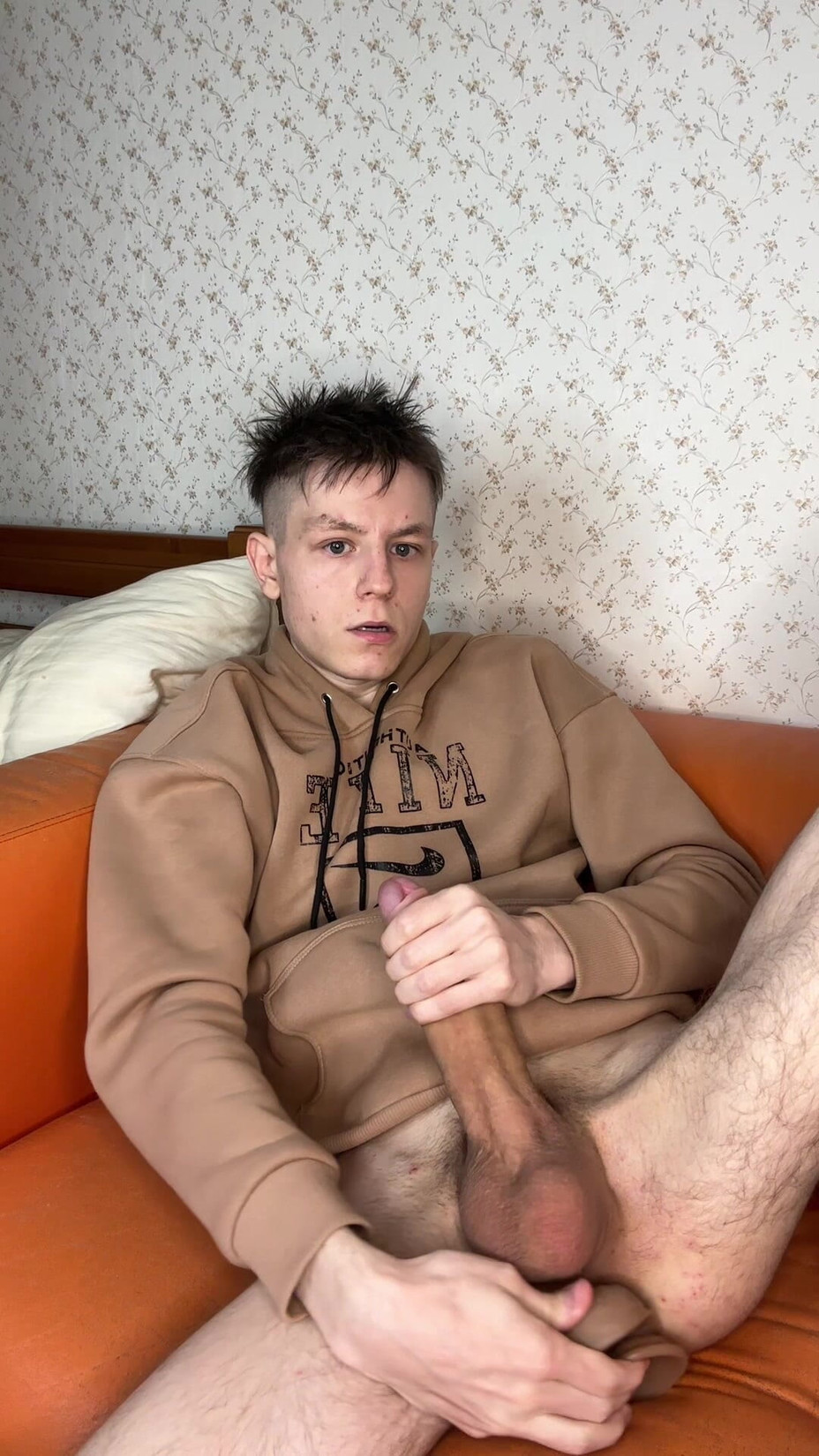 I’m an 18-year-old skinny twink with a massive young cock that barely fits in my hand. Watch this amateur twink strip totally naked. Grab that big cock and start a hot handjob. Slow strokes from the base up to the shiny head. Then faster and faster till the veins bulge and my balls slap against my thigh. My abs flex tight. My back arches. And boom—huge gay cumshot! Thick ropes of cum blast across my chest. Drip down my abs. And I milk out the last drops onto my fingers. Homemade solo from a cute gay boy who knows how to edge himself to explosion.