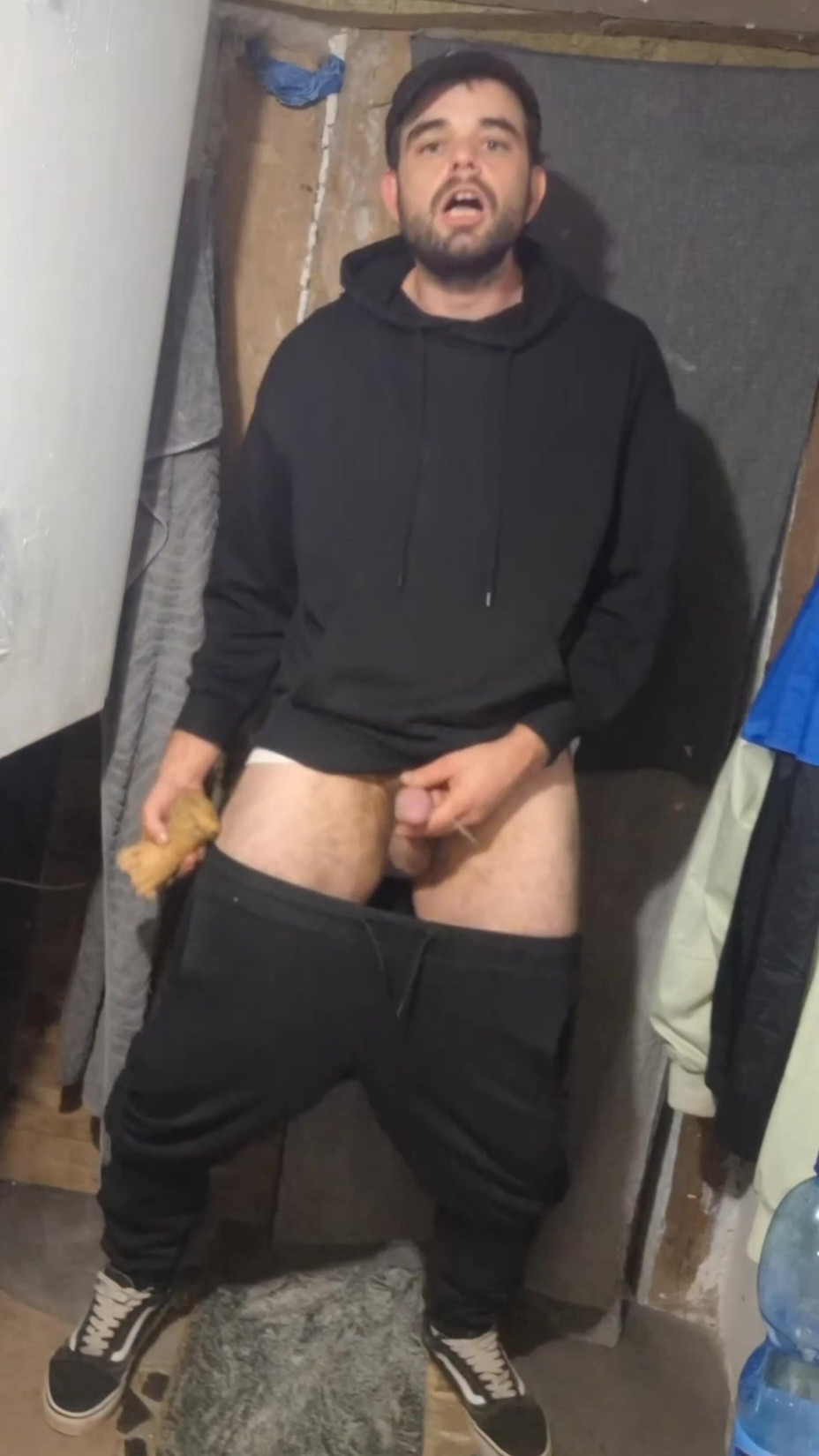 Skater squirting in an abandoned building, wearing black VANS things, a cap and experiencing an extra big orgasm and wearing VANS shoes
